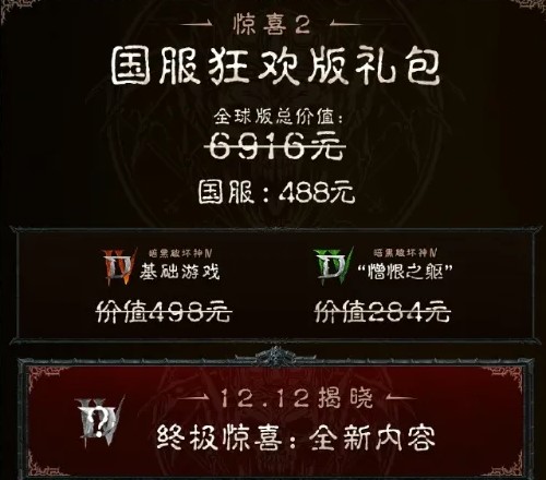 - 狂欢版 (高级版):价格:488元 包含啥:基础游戏本体首个大型资料片“憎恨之躯” (DLC) 重磅!海量外观奖励: 官方宣称总价值 6916元!具体包括:第1到第10赛季所有通行证里的外观奖励 (1943件) 商城热销的30套外观套装 (199件) 国际服基础游戏终极包里那些外观 (9件) 一个终极惊喜:全新内容 (官方卖关子,12月12日上线才揭晓) (小道消息普遍猜测是第二个大型DLC的首次曝光或相关内容适合谁: 想一步到位玩到最新DLC内容,并且是外观收集党、时装控的兄弟。这个礼包东西确实多,虽然标价6916元有水分,但488能拿下本体+DLC+海量外观,性价比对于喜欢打扮角色的玩家来说非常高。 值不值看你对外观的需求了。